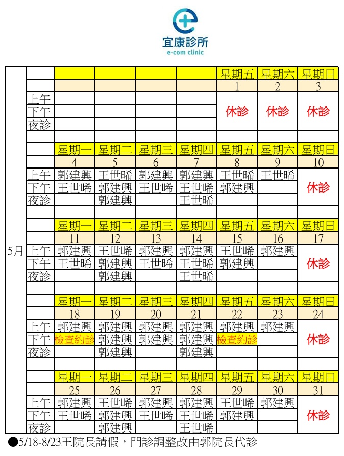 2026年5月門診表